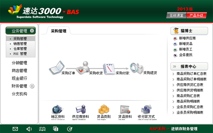 《速達3000G-BAS》集進銷存、POS、財務(wù)為一體的中小企業(yè)管理軟件系統(tǒng)。系統(tǒng)采用導(dǎo)航式界面,易學(xué)易用、 功能強大,是幫助中小企業(yè)規(guī)范經(jīng)營管理、財務(wù)管理的有效工具。系統(tǒng)支持局域網(wǎng)/互聯(lián)網(wǎng)多用戶應(yīng)用,實現(xiàn)異地多機構(gòu)、多店面、多倉庫等遠程應(yīng)用,支持Android移動終端應(yīng)用,數(shù)據(jù)實時同步,安全、穩(wěn)定、高效、易維護,特別適合中小企業(yè)使用。